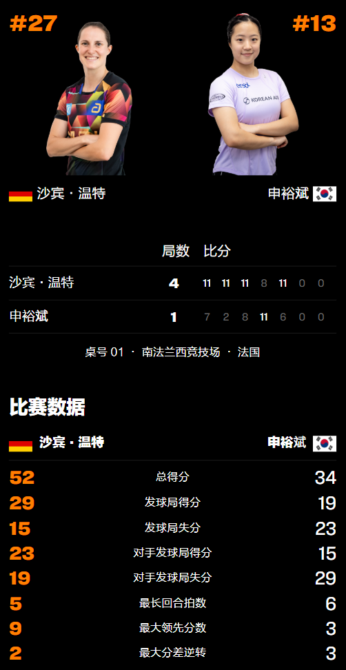 申裕斌出生于2004年,目前排名世界第14位,是韩国女队的头号主力;温特是一位出生于1992年的老将,最新排世界第26名,是当今乒坛少有的使用防弧胶的选手,而且是近年来改的打法,效果非常不错,此前有战胜国乒主力陈幸同、差点击败王艺迪的战绩。