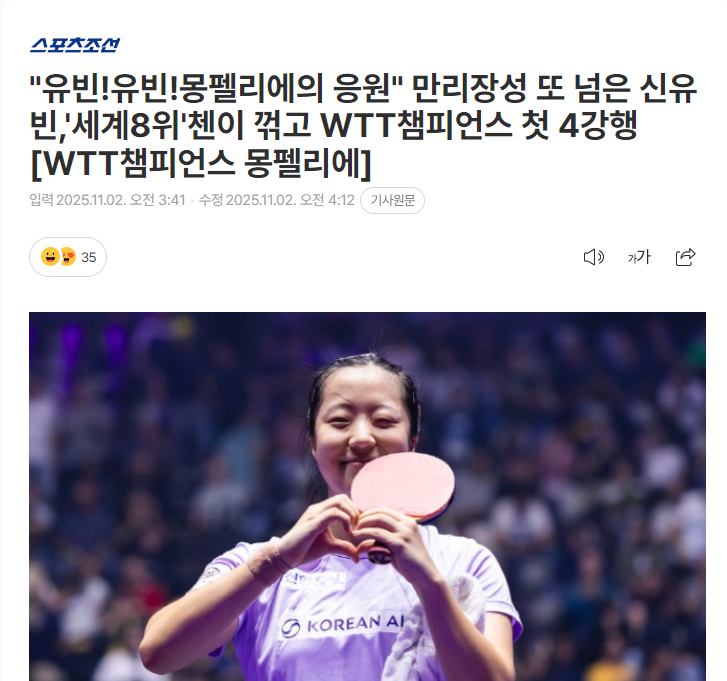 本次蒙彼利埃冠军赛四强选手有两位来自韩乒(朱芊曦、申裕斌),这又创造了韩乒历史的一个纪录,韩乒历史首次在WTT1000+赛事有两位选手同时进入半决赛。