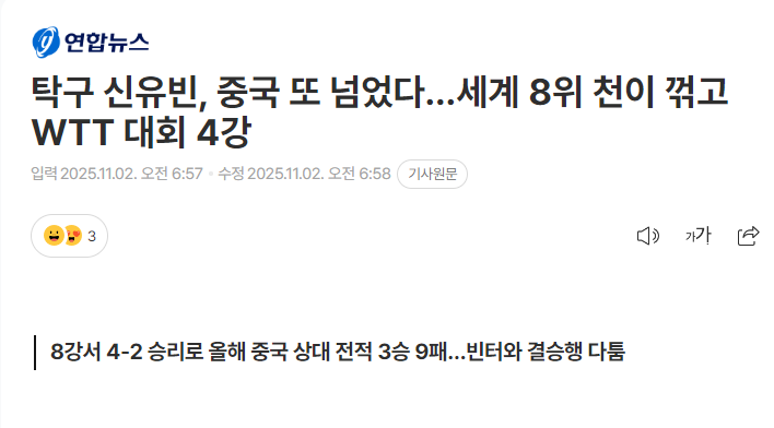 另一韩媒写道:申裕斌又一次越过长城,在法国站晋级四强,她击败陈熠后本赛季面对中国选手的战绩来到3胜9负。
